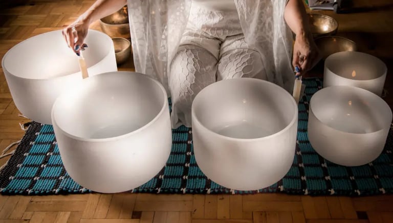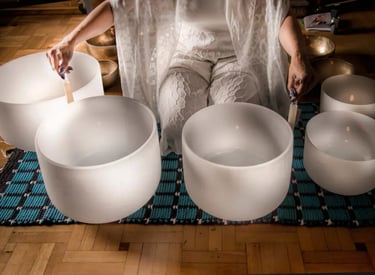 Each session is a sacred sound journey, where the pure frequencies of quartz crystal bowls interact with your body's energy centers, dissolving blockages, restoring flow, and activating deep cellular remembrance.